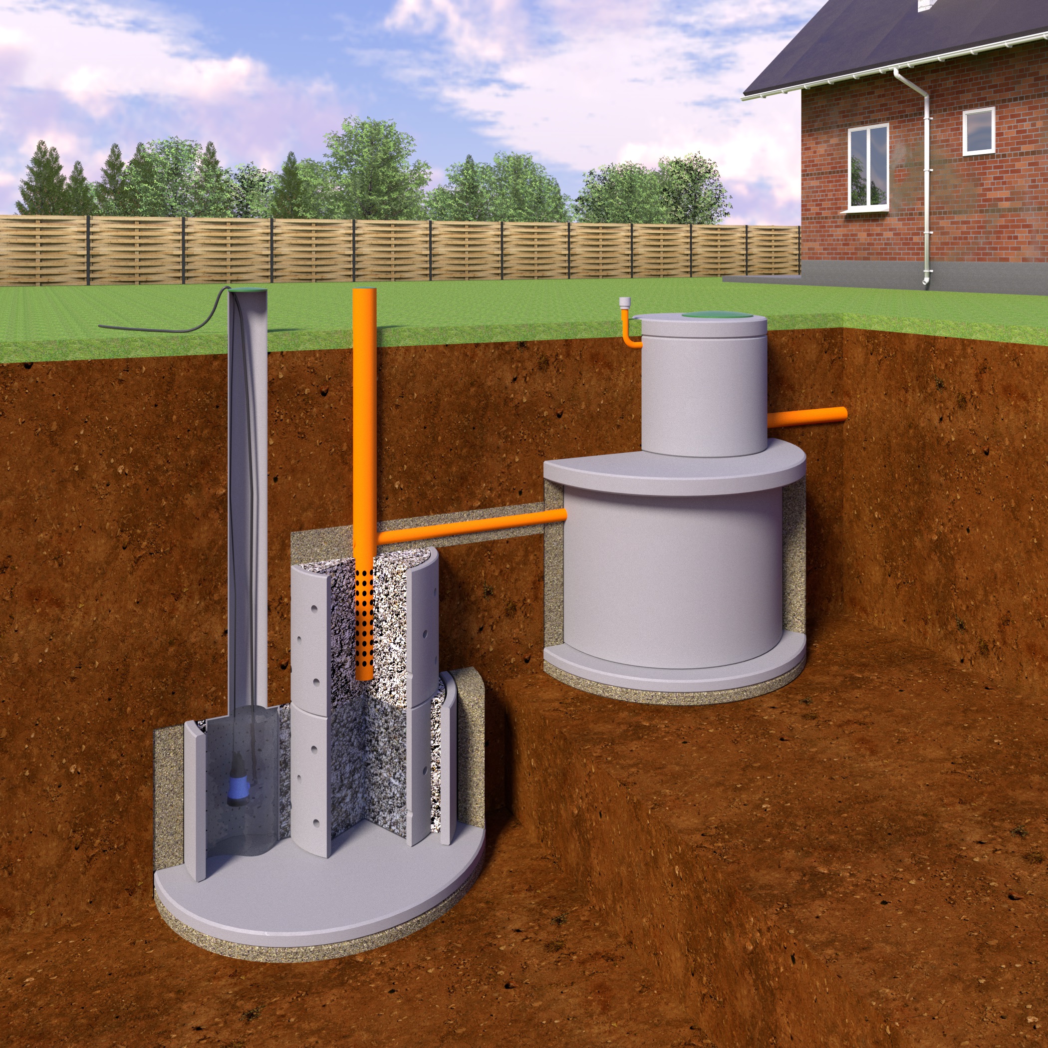 - une option avec une station de pompage, si le site est bas et que les eaux usées doivent être élevées plus haut - ce principe convient si la machine d'égout ne peut pas pénétrer sur le site.