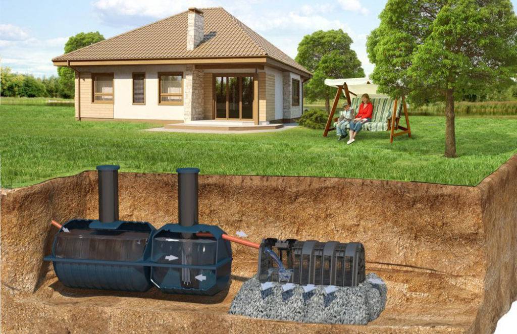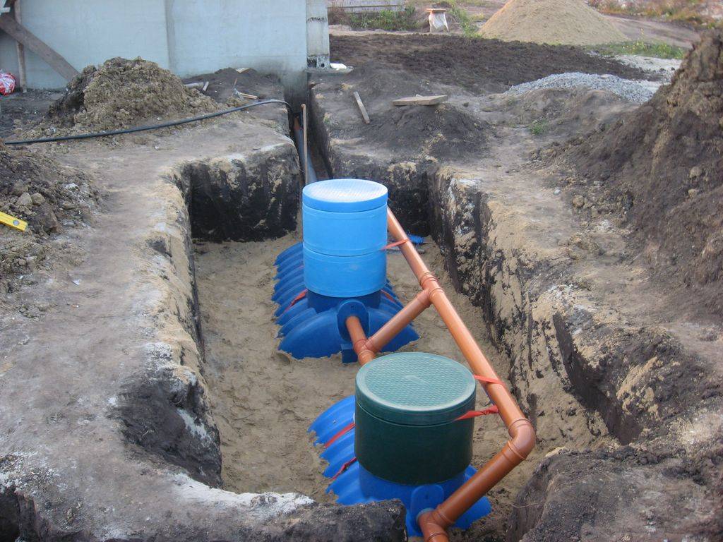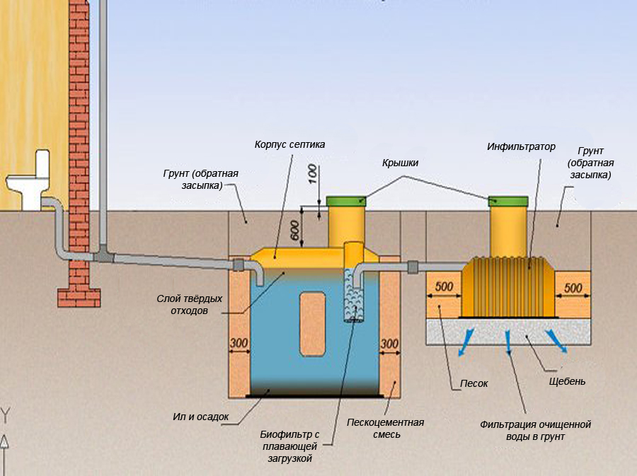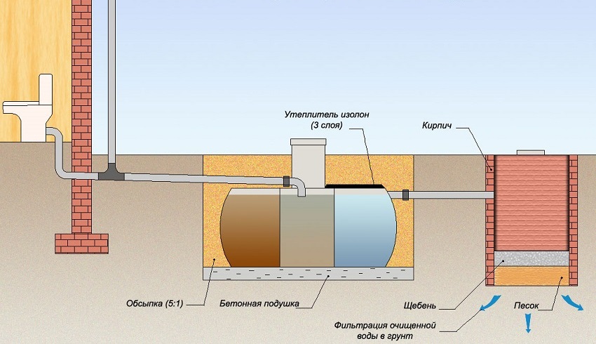 Si le GWL est élevé et que le chalet est grand, une fosse septique avec un champ de filtration ou un infiltrateur peut être montée pour nettoyer les égouts. Dans ce cas, le drainage de l'eau dans le sol se fait également à travers un filtre à sable et gravier. Cependant, il se trouve ici au fond d'un puits vertical étroit, et sur un « terrain » situé à l'écart des fondations de la maison sous la forme de tuyaux de drainage ou d'une grande structure d'infiltration.