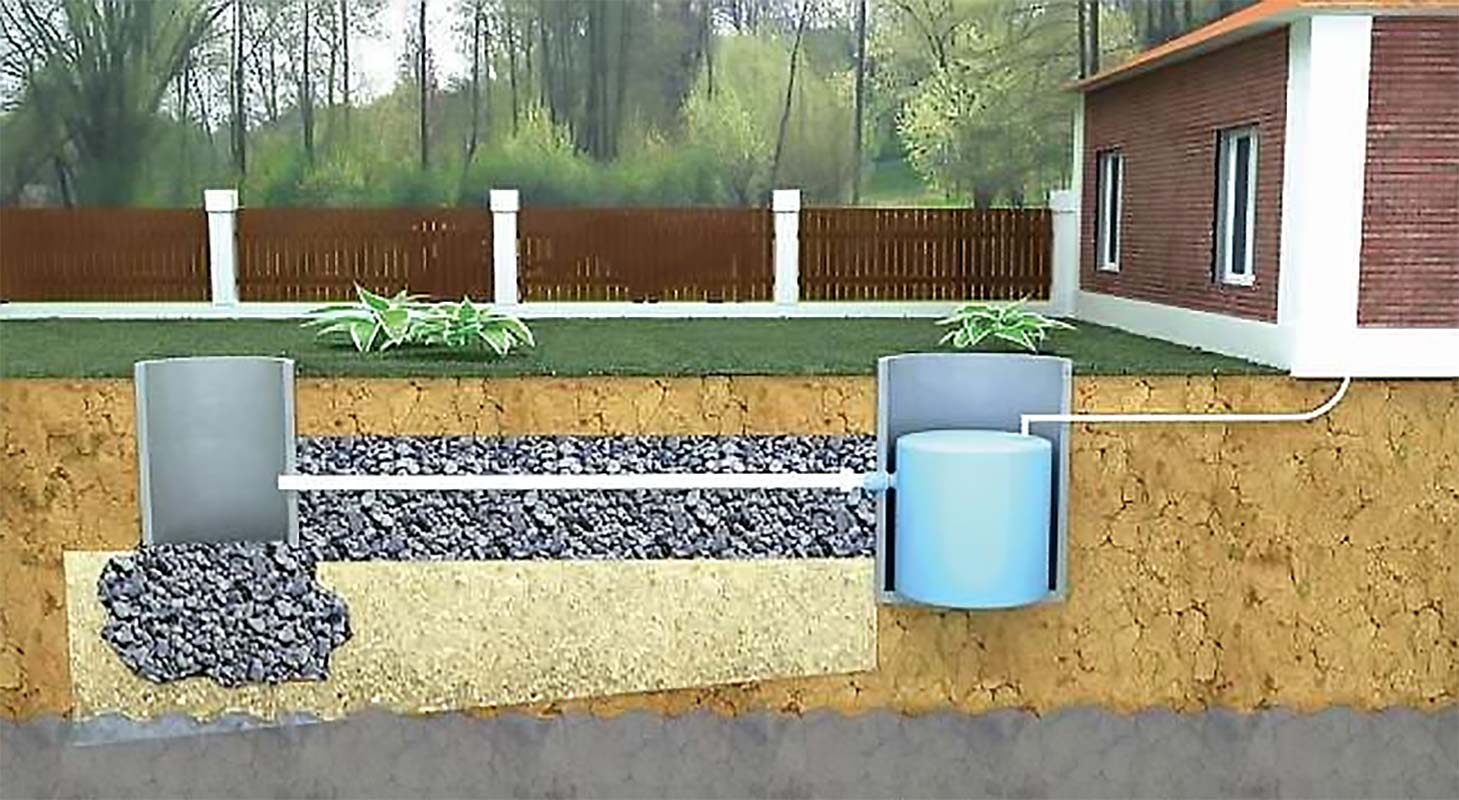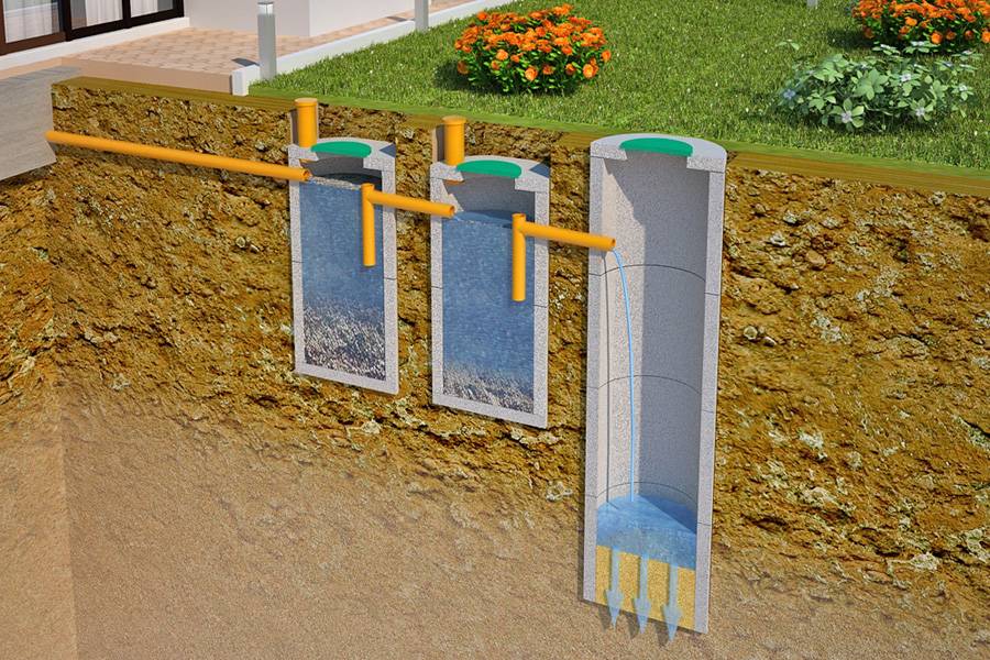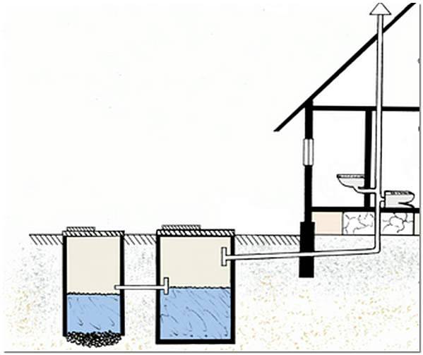 - deux puits - un pour les particules solides avec un fond scellé, le second sans fond pour filtrer et drainer l'eau dans le sol, les puits sont installés en série ;