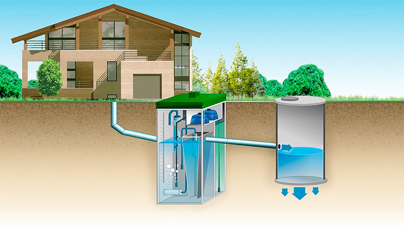 Une fosse septique aérobie (une station de traitement biologique actif) est le maximum en termes de productivité et d'efficacité, qui est parmi systèmes d'assainissement autonomes pour maison privée. Le traitement des eaux usées ici est effectué par des micro-organismes aérobies qui ont besoin d'un apport constant d'oxygène. Cela se fait à l'aide d'une pompe électrique, une telle fosse septique étant volatile. Mais d'un autre côté, le taux de «mange» de matière organique par les bactéries est élevé et le degré de purification oscille autour de 98 à 99%. Un sérieux inconvénient est le coût élevé de la station.
