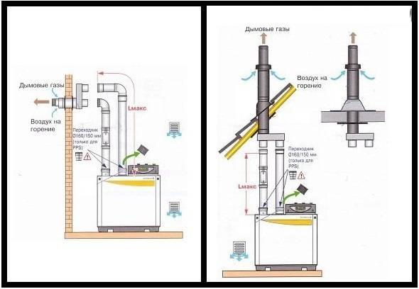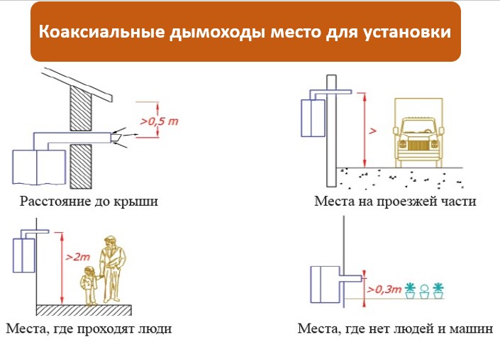 Dispositif de cheminée coaxial et normes pour son installationLa cheminée peut être conduite à l'extérieur à travers le mur en proximité immédiate de la chaudière ou voie traditionnelle à travers le toit