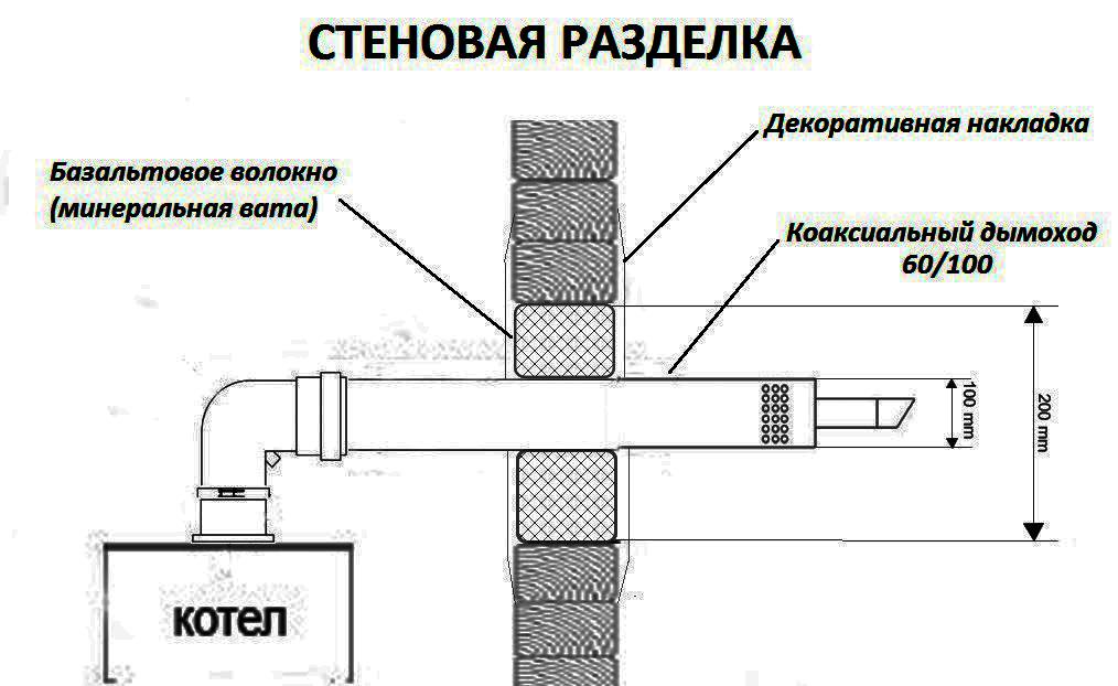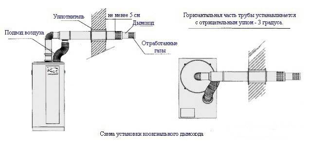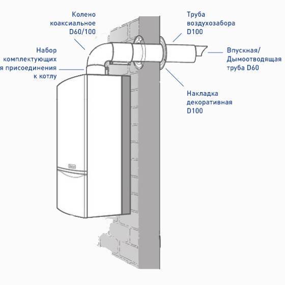 Pour les chaudières à chambre de combustion fermée, on utilise une cheminée coaxiale, qui est une structure composée de tuyaux de différents diamètres. Un tuyau de plus petite section est fixé à l'intérieur d'un tuyau de plus grand diamètre au moyen de crémaillères spéciales. À travers le canal intérieur, le dioxyde de carbone et les autres produits de combustion sont éliminés, et à travers l'espace entre les tuyaux extérieur et intérieur, l'air frais pénètre dans la chambre de combustion fermée.