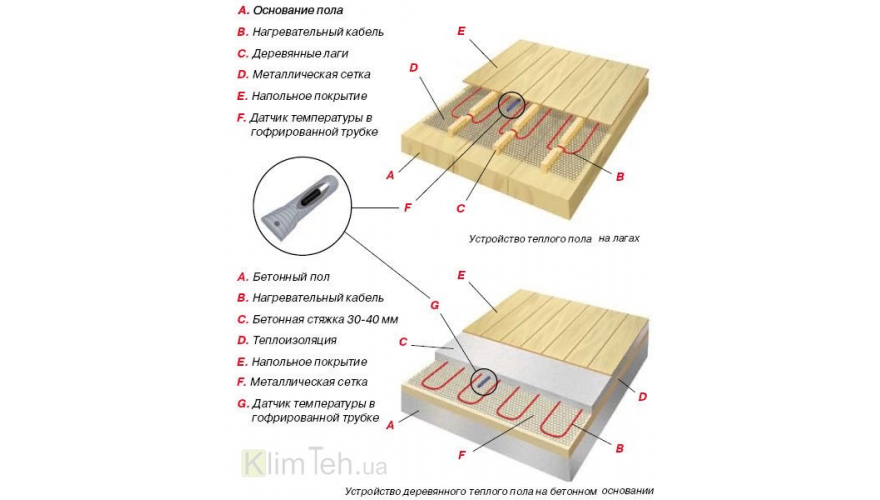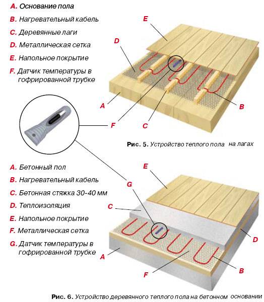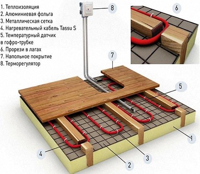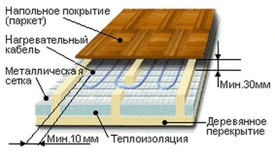 Le sol est ensuite imperméabilisé. Un matériau d'étanchéité enroulé ou polyéthylène 200 microns est posé sur le plancher en bois. Un matériau d'isolation thermique laminé, tel que le Tizol, est posé sur l'imperméabilisation. Il s'agit d'un isolant en rouleau avec une face en aluminium. L'isolation est posée avec une feuille sur le dessus. Le câble électrique thermique est posé au-dessus de l'isolation thermique. Le câble est attaché à des supports spéciaux, avec des boucles avec une étape pré-calculée (en magasin). La chape est coulée sur le câble chauffant posé. Avant de couler la chape, un régulateur de température (sur le mur) et un capteur de température sont installés entre les boucles du câble posé.