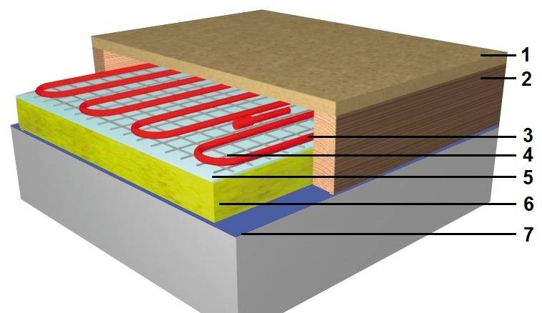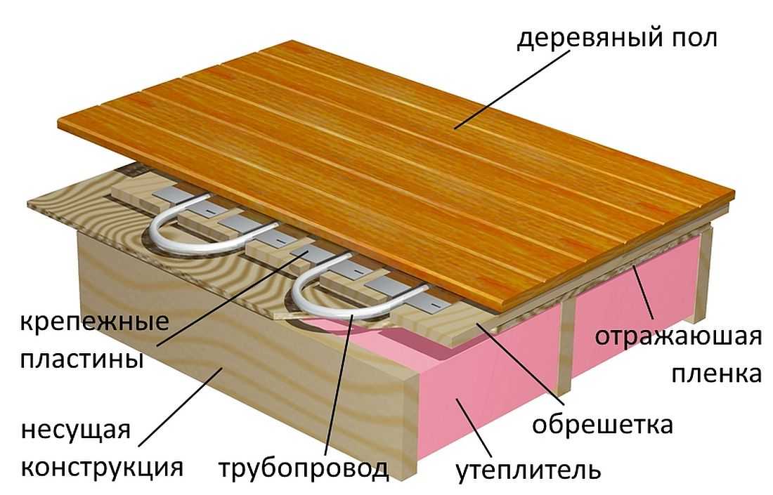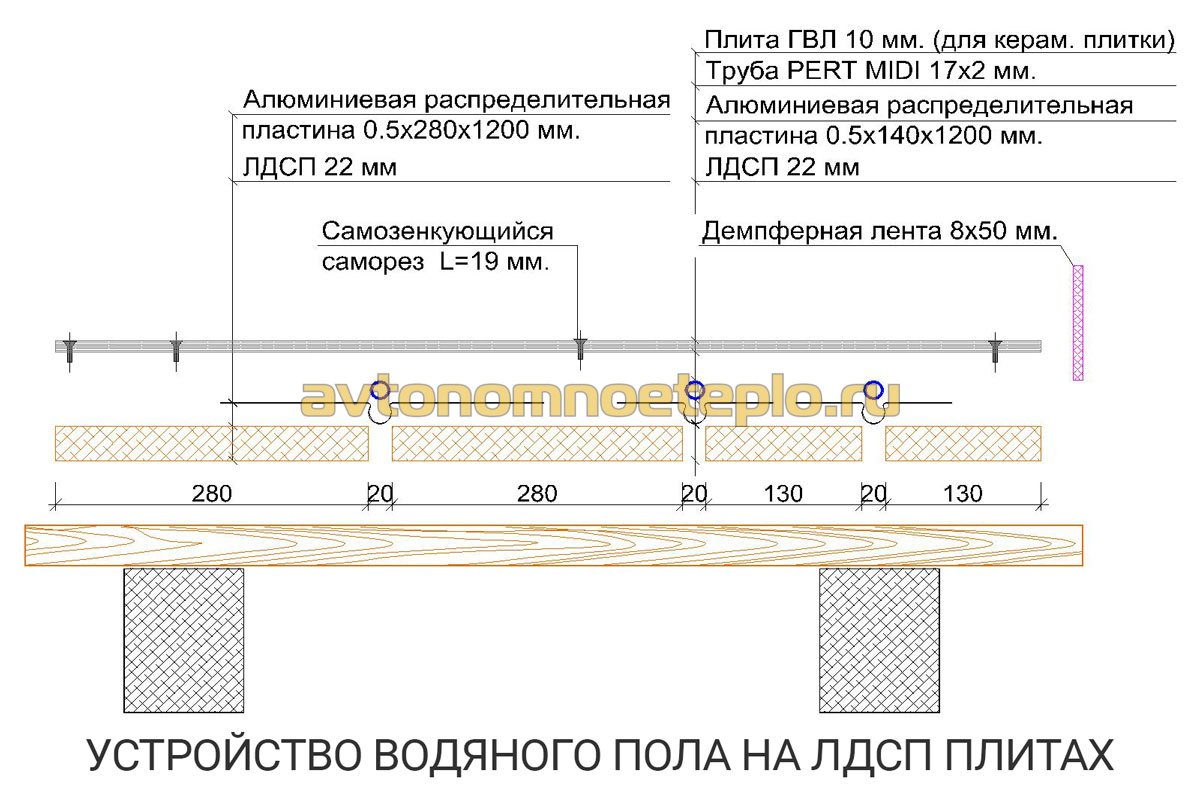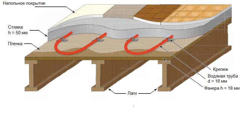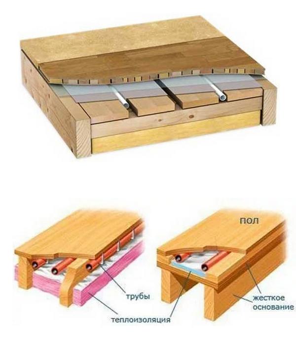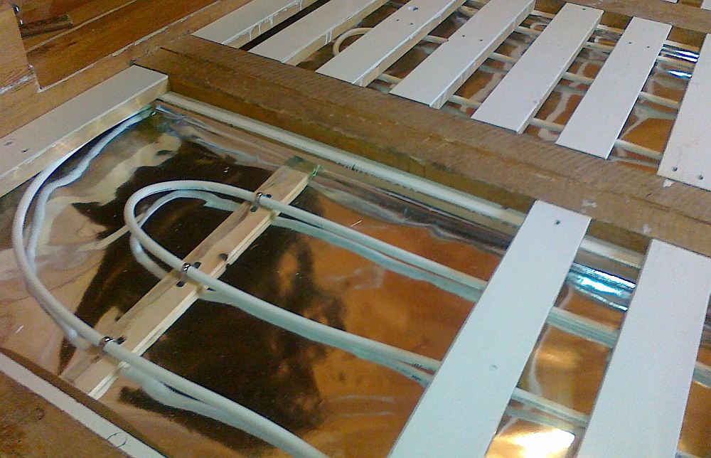 La faiblesse de l'appareil illustré : il y a un espace d'air entre le tuyau et le contreplaqué, qui n'a pas besoin d'être : il aggrave la conductivité thermique du sol.