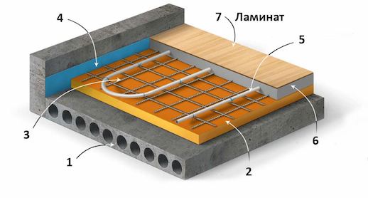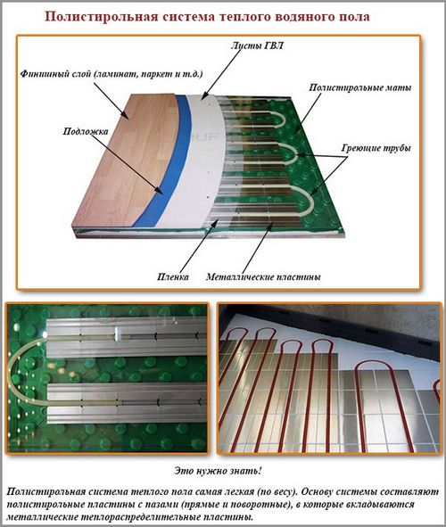 Si un procédé d'installation plus complexe est choisi, un treillis métallique sera nécessaire pour fixer les éléments de structure, des tuyaux en polyéthylène sous haute pression d'un fluide caloporteur, une sonde de température située dans l'ondulation, une feuille d'aluminium, un régulateur de température de type mécanique ou automatique .
