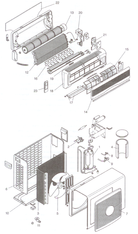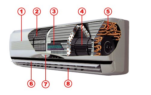 - le ventilateur aspire l'air chauffé de la pièce dans l'unité intérieure - et le transmet au serpentin de l'échangeur de chaleur ;