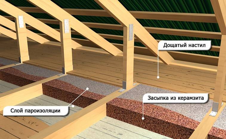 Dans les maisons privées, isolant le sol du premier étage, les matières premières sont également posées le long des rondins fixés sur de petites collines de briques, tout en posant entre elles une imperméabilisation et un revêtement en planches.