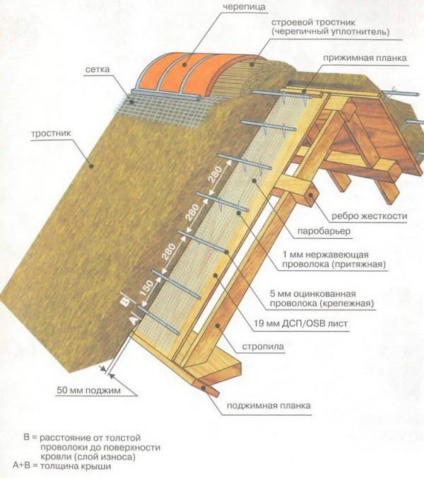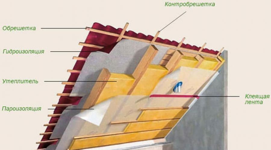 • Dans l'espace entre les chevrons avec revêtement de grenier, il est séparé par une couche de pare-vapeur.Et au-dessus de la "tarte" de la toiture, un film barrière à la vapeur d'eau est étiré (le long des chevrons), qui est pressé avec des barres.