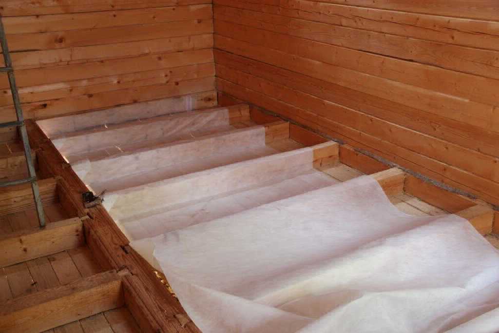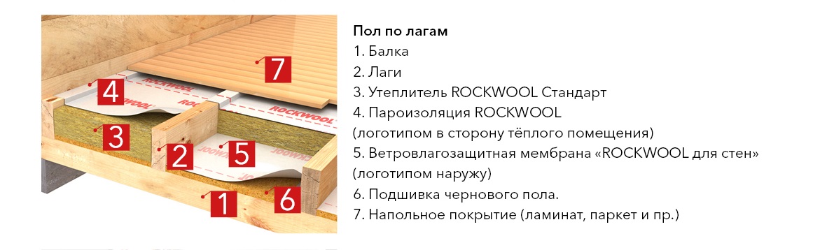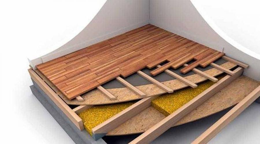 Un plancher en bois est une planche bourrée sur des rails porteurs. Des barres ou des rondins peuvent être utilisés comme guides, qui sont placés soit sur des poteaux, soit dans des niches murales spéciales. Les guides ne sont placés sur les poteaux que lorsque le sol est érigé au premier étage, et des barres ou des bûches fixées dans les murs peuvent également être utilisées comme plafond entre les étages. Les guides des deux côtés sont cousus avec une planche, ce qui affecte directement la méthode d'isolation du sol avec de la laine minérale. La technologie consiste à poser une isolation thermique dans les vides entre le sous-plancher et le plancher de finition.