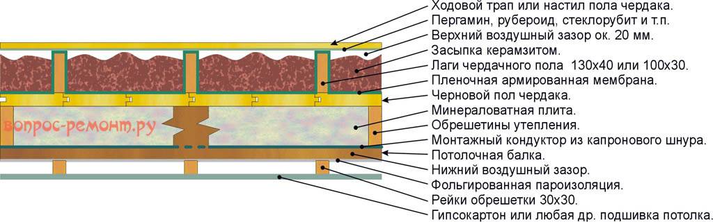 - Si le sol du grenier est fabriqué à l'aide de dalles en béton armé, il est optimal d'utiliser de l'argile expansée comme appareil de chauffage, mais il est plus judicieux de protéger les sols en bois avec de la laine minérale ou de la laine de cellulose, car ces matériaux sont considérés comme « respirants », et ils éviter la formation de condensat, ainsi que la destruction du bois.