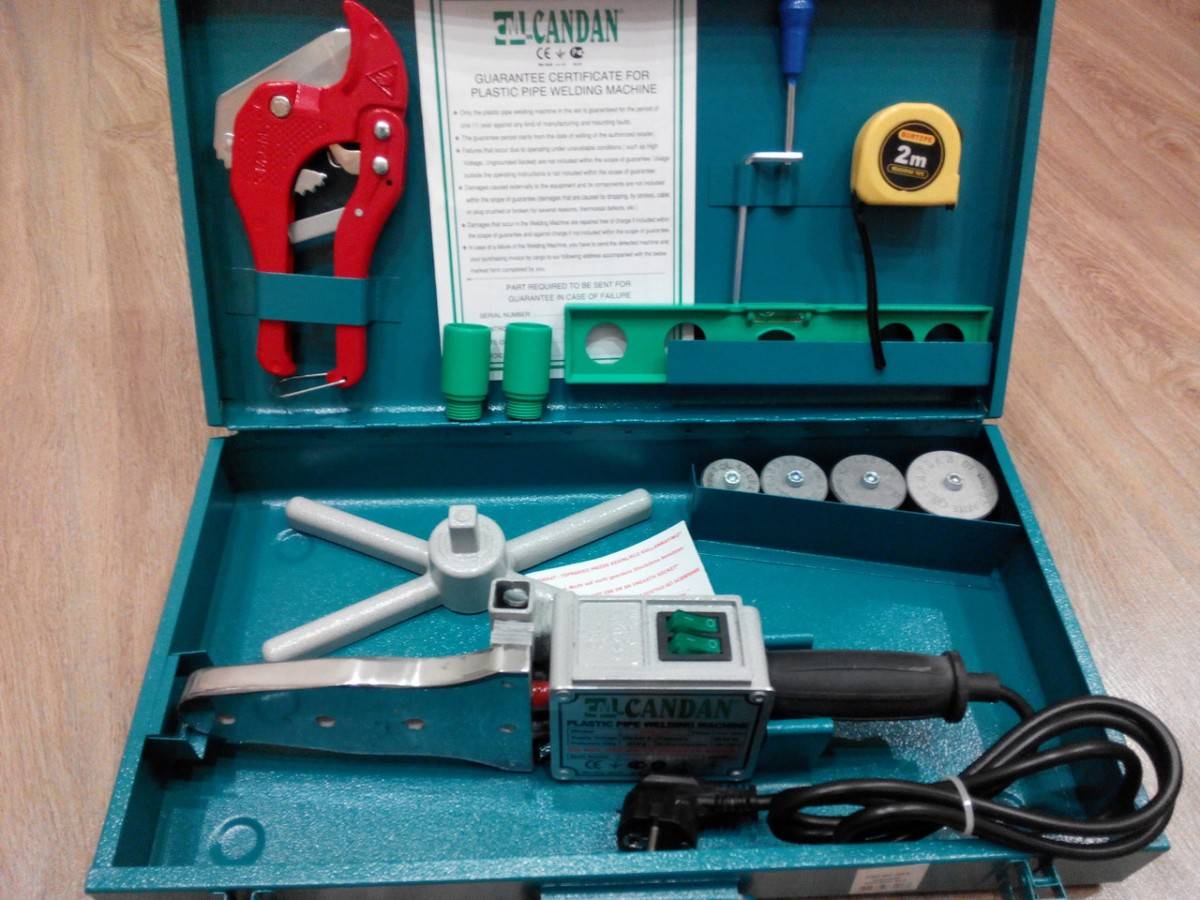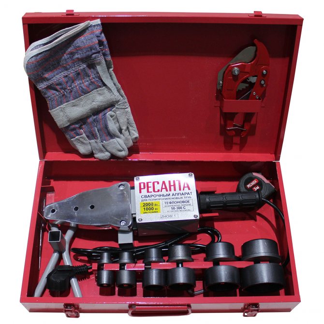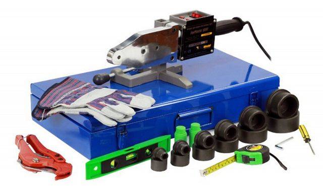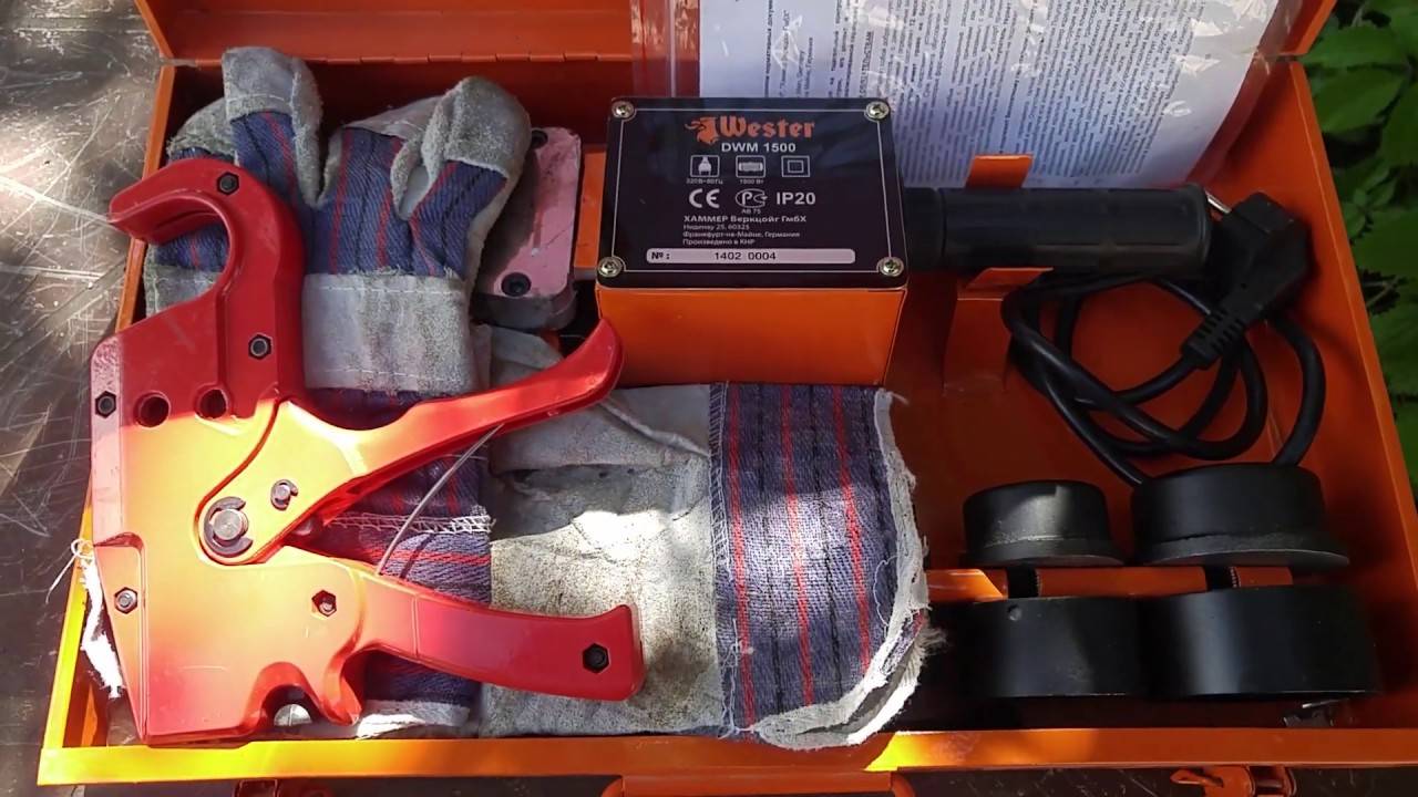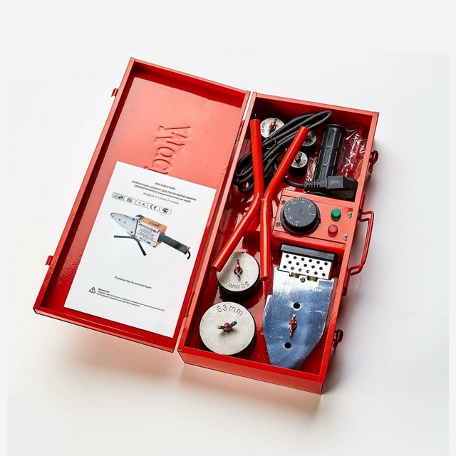 Fer à souder Black Gear PPRC 1500 W CN-005 20 × 63 IS.090786 d'une puissance de 1500 W coûte environ 3000 roubles et permet un chauffage rapide des buses et des tuyaux eux-mêmes. L'unité est proposée dans un ensemble comprenant des buses d'un diamètre de 20 mm à 63 mm, une clé pour leur installation, un support, ainsi que des ciseaux pour couper les tuyaux, un niveau, un ruban à mesurer et un étui. Les éléments chauffants ont un revêtement en téflon de haute qualité. Lorsqu'il est utilisé, le polypropylène ne colle pas aux buses.