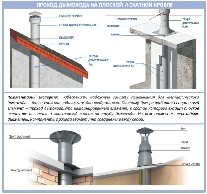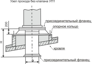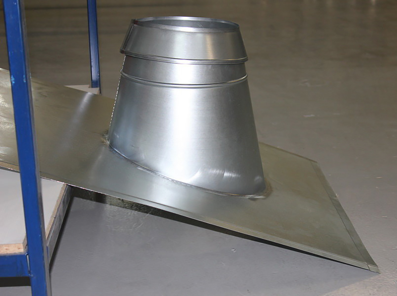 Les structures de ce type sont en polymères, en acier inoxydable de 0,5 à 0,8 mm d'épaisseur et en acier noir de 1,5 à 2 mm d'épaisseur. La section transversale du nœud de transition fini peut être ronde, ovale, carrée ou rectangulaire. Un modèle spécifique est choisi en fonction du type de matériau de toiture et des paramètres du tuyau de ventilation.