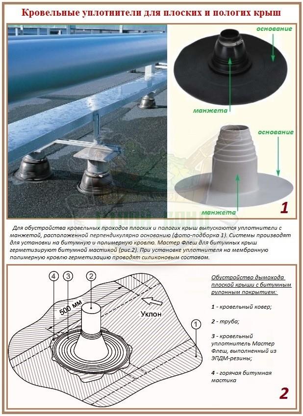 Les unités typiques de pénétration à travers le toit, fabriquées dans des entreprises industrielles, sont très diverses, elles sont sélectionnées en fonction de la taille du tuyau et des caractéristiques du toit