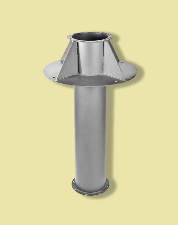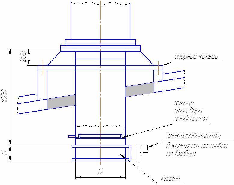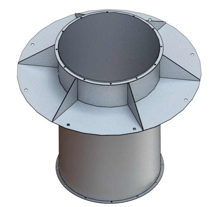 L'anneau de support, qui fait partie de la structure d'assemblage, garantit une connexion parfaite entre la structure et la surface du toit. Les brides d'embrayage assurent une fixation fiable - la inférieure est reliée au conduit d'air, la supérieure est le support du parapluie de ventilation, qui protège le tuyau des précipitations. Un anneau est placé à l'intérieur du tuyau, ce qui garantit l'évacuation des condensats.