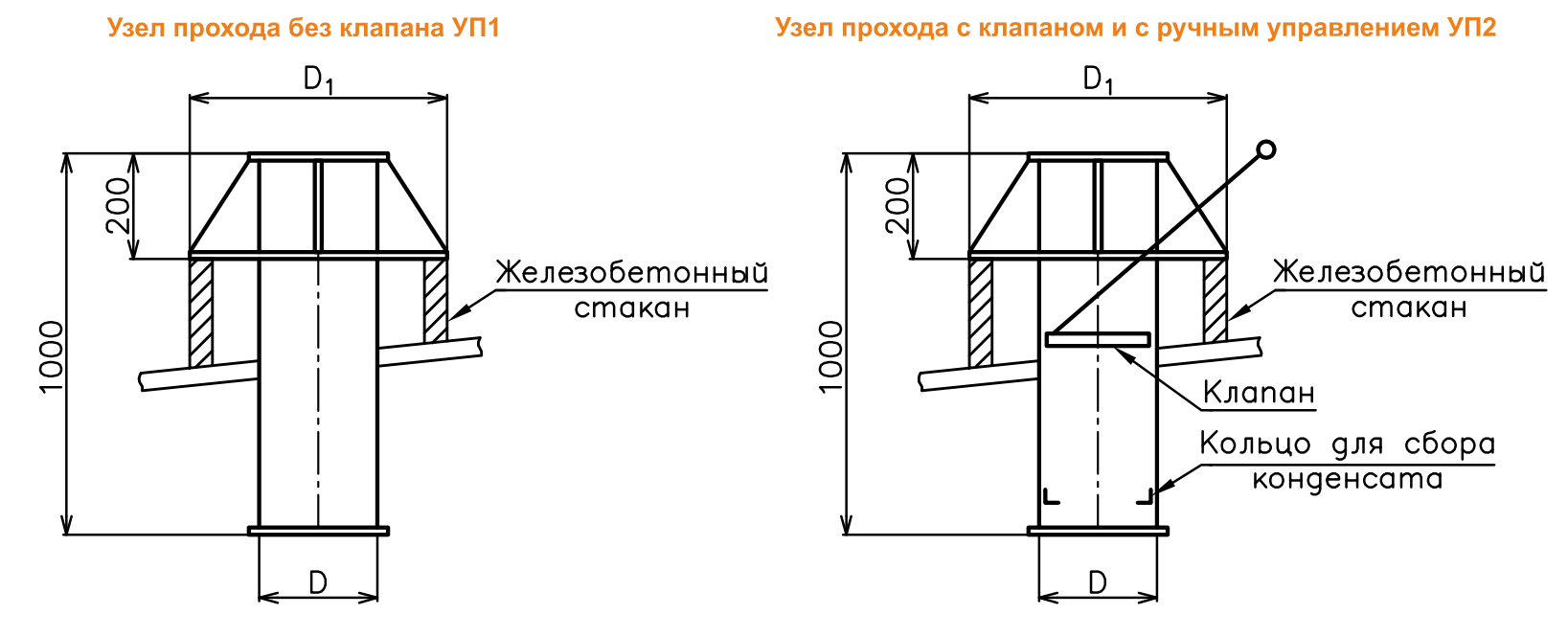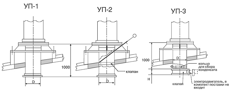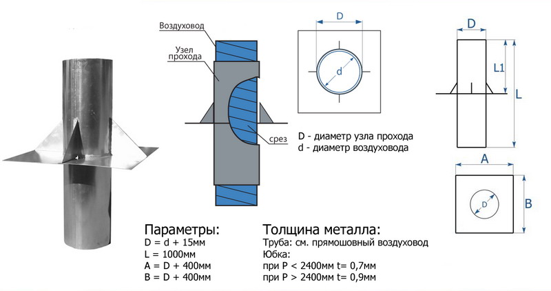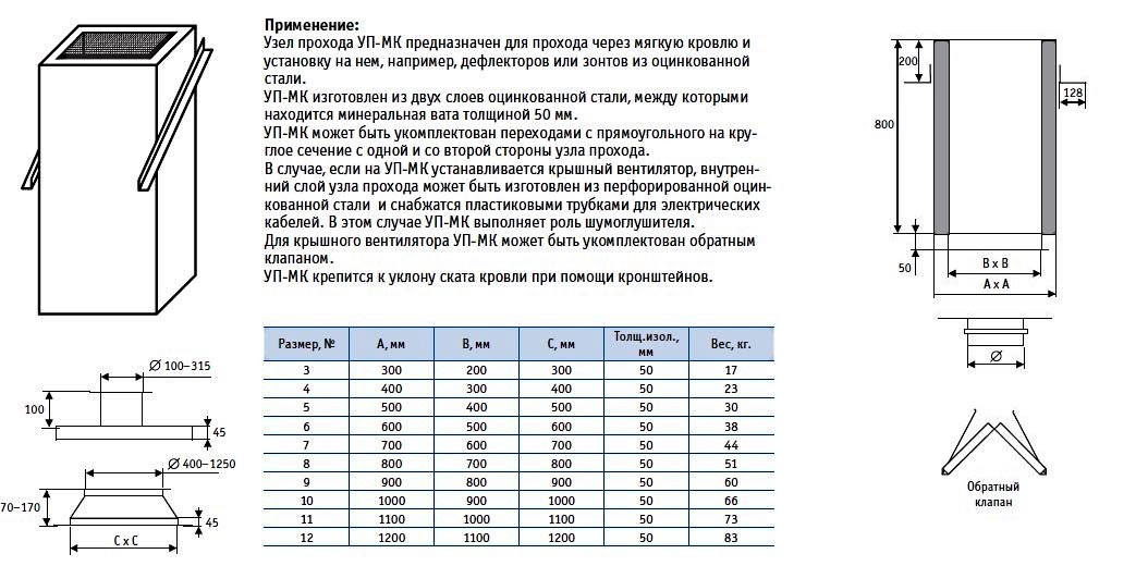 Les structures de ce type sont en polymères, en acier inoxydable de 0,5 à 0,8 mm d'épaisseur et en acier noir de 1,5 à 2 mm d'épaisseur. La section transversale du nœud de transition fini peut être ronde, ovale, carrée ou rectangulaire. Un modèle spécifique est choisi en fonction du type de matériau de toiture et des paramètres du tuyau de ventilation.