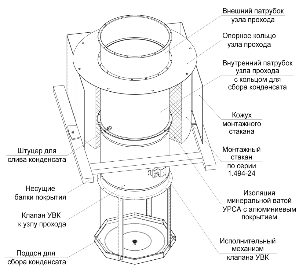 Cet élément ne doit pas être installé à côté de l'anneau de collecte des condensats afin de maintenir l'intégrité de tous les éléments de pénétration. Les modèles de nœuds typiques sont généralement montés avant le début des travaux de toiture : d'abord, les conduits du système de ventilation sont montés, puis le passage, et le toit est ensuite placé.