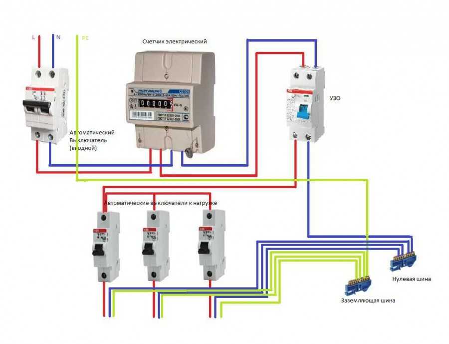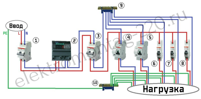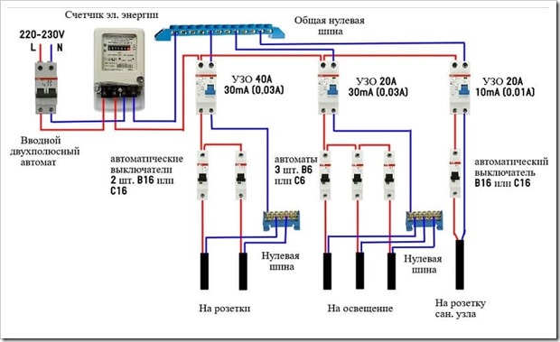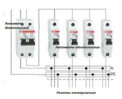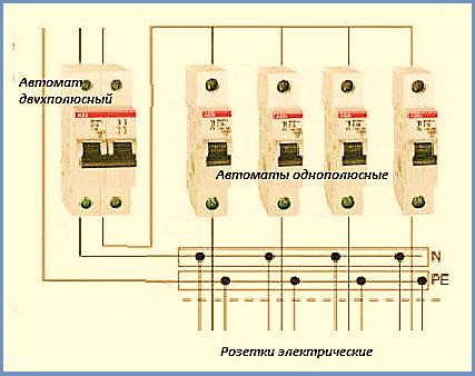 S'il y a également un troisième fil entrant (mise à la terre), un appareil bipolaire doit être installé. Le zéro et la phase sont directement connectés à l'interrupteur et le fil de terre est acheminé à travers la boîte à bornes à travers les appartements. Ensuite, les deux fils de la machine sont connectés à un compteur électrique et à des machines unipolaires, qui sont réparties entre les groupes de contrôle.