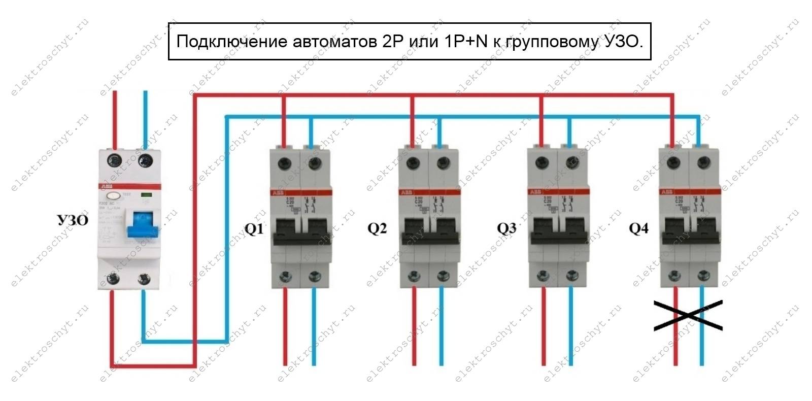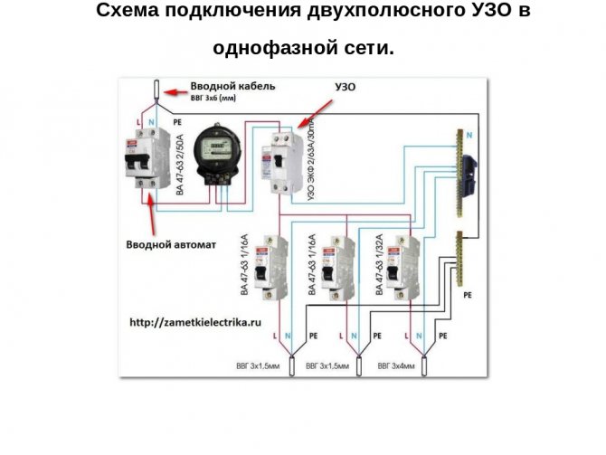 Des courants de fuite peuvent se produire lorsque l'isolant des fils se rompt sur le corps des appareils électriques et qu'une personne le touche. Dans ce cas, ce type de protection sauve la vie d'une personne. Le fonctionnement du RCD est basé sur la détermination de la différence entre la phase et le courant zéro, il a donc deux bornes pour la connexion de phase et zéro, deux autres bornes de sortie de phase et zéro pour connecter la charge.