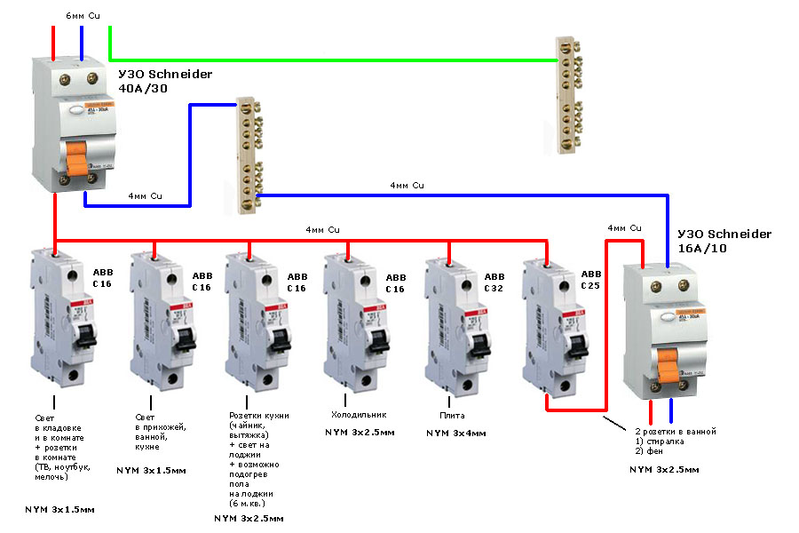 Dans notre cas, un fil à trois fils est utilisé, en plus de la phase et du zéro, il y a un fil de terre. En aucun cas il n'est relié à travers un disjoncteur, un contact traversant lui est prévu. A l'intérieur, il est relié par un bus métallique afin que le fil passe sans interruption jusqu'à sa destination finale, généralement des prises.