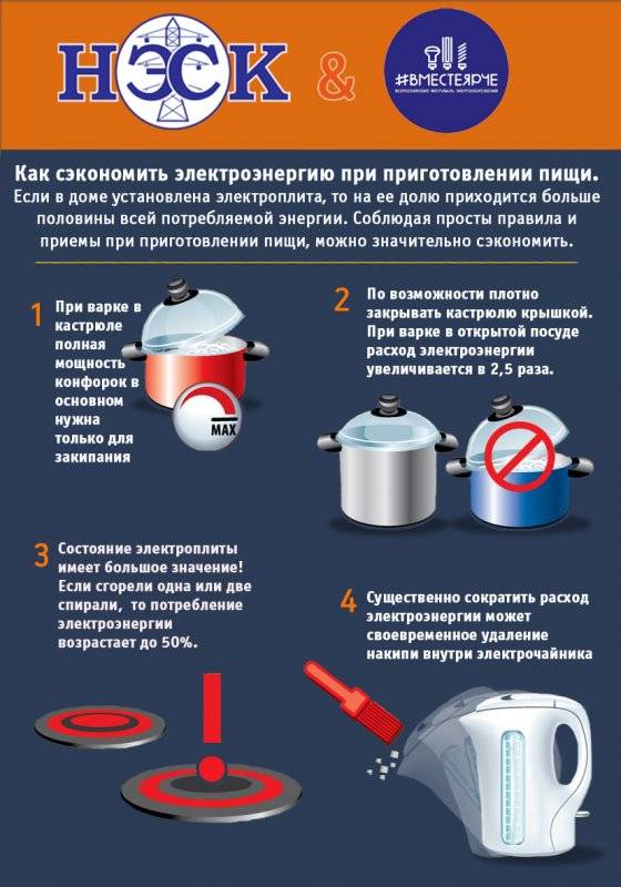 3. Une cuisinière électrique et un four électrique consomment 0,5-3 kW/h. Avec une utilisation appropriée, les coûts énergétiques peuvent être réduits de 30 %. Pour ce faire, lors de l'utilisation du réchaud, il est nécessaire d'utiliser des plats dont le diamètre est égal ou supérieur au diamètre du brûleur. De plus, le brûleur et le four doivent être éteints dix minutes avant la cuisson du plat.