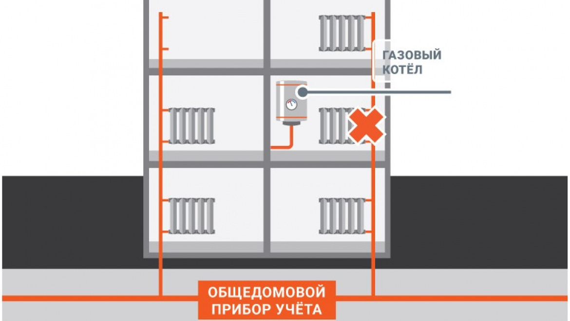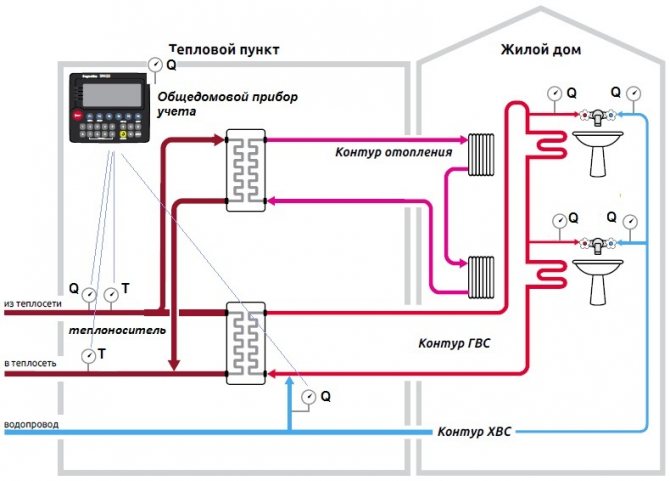 Parfois maison commune compteurs de chauffage sont installés pour un contrôle général de la consommation d'énergie thermique en présence de leurs propres compteurs dans chaque appartement. Dans ce cas, les locataires paient en fonction des compteurs à la fois dans l'appartement et dans les parties communes (par exemple, dans l'entrée).