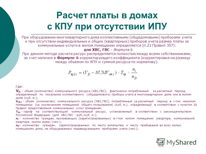 | Absence de compteur personnel dans un appartement séparé | Les relevés ODPU sont tirés de tous les appareils de mesure disponibles dans un appartement particulier, moins la différence avec le rapport du compteur de la maison commune, le résultat est divisé par la superficie de toute la maison et multiplié par le montant de la superficie et la part des appartements sans compteur. Ce n'est qu'après cela qu'ils se multiplient par le coût de chauffage par mètre cube. M. | Pi = ( Vi + Si * ( Vd - ∑Vi ) / Sb)xT, où :