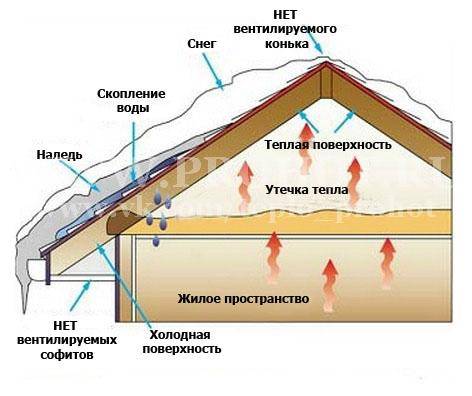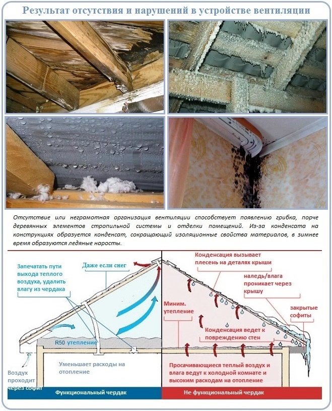 En hiver, la ventilation aide à éliminer l'humidité accumulée. Selon les exigences techniques de sécurité, la température dans le grenier et dans la rue ne doit pas différer de plus de 4 degrés, car les fortes chutes de température créent des conditions favorables à l'accumulation de condensat, qui forme ensuite des glaçons. Avec le début du dégel, ils fondent et l'humidité pénètre sur le sol, ce qui entraîne une déformation et une destruction de la structure du plafond et du toit, une moisissure dangereuse apparaît sur les chevrons.