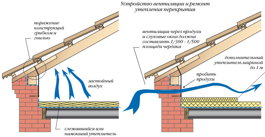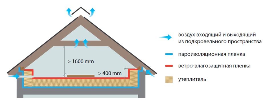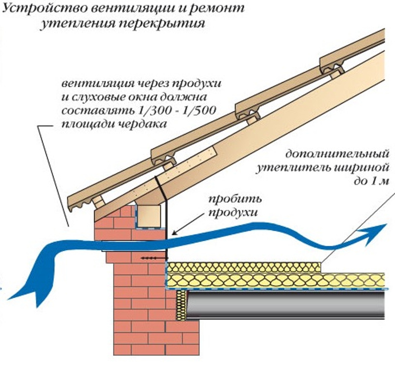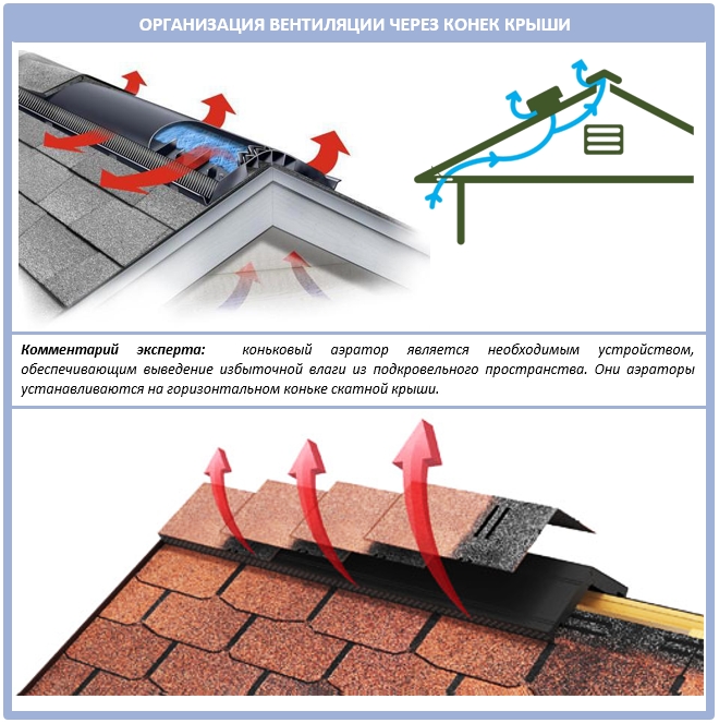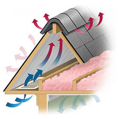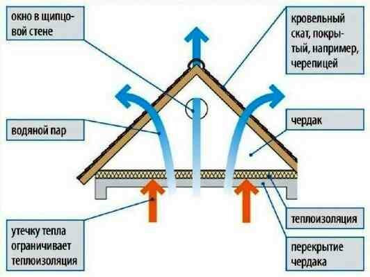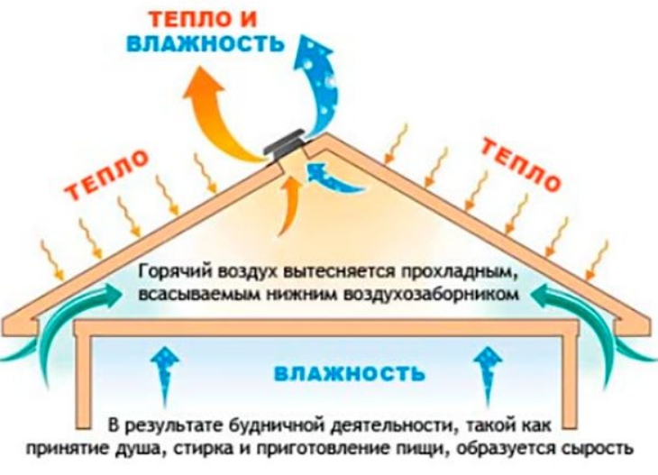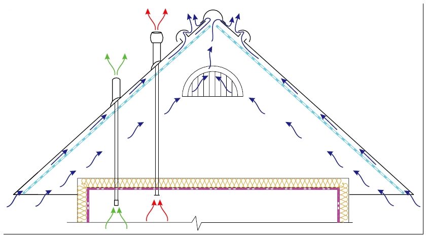 Ventilation combles du grenier disposés selon le principe de la circulation naturelle de l'air. Il pénètre dans des cavités spéciales entre l'étanchéité et l'isolation thermique dans la zone de l'avant-toit. L'enlèvement est effectué sur la partie supérieure du toit dans la zone de crête.