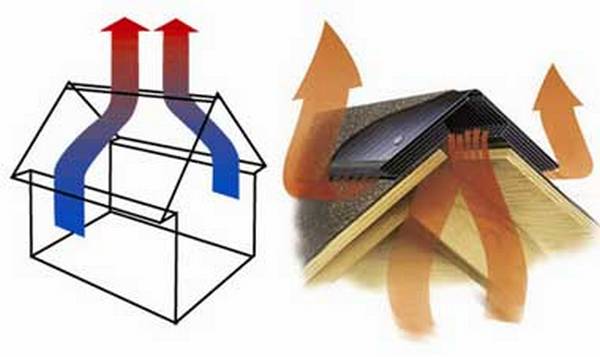 Le moyen le plus rationnel d'assurer un échange d'air uniforme est l'emplacement des évents le long du périmètre du bâtiment, ainsi que sur toute la longueur du faîte du toit.