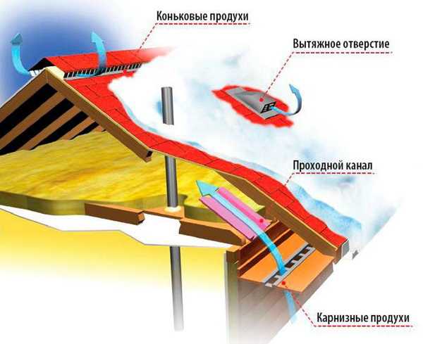 La tourte de toiture est ventilée avec des bouches d'aération - des canaux longitudinaux posés du surplomb de la corniche à la crête de la crête. Les évents sont formés lors de la pose des lattes et contre-lattes sur les pattes des chevrons.