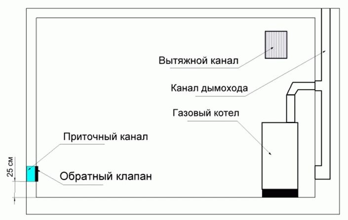Une telle ventilation est utilisée dans les petites maisons privées équipées d'appareils de chauffage de faible puissance. Des ouvertures pour l'arrivée d'air propre de l'extérieur sont équipées aux extrémités opposées de la chaufferie. Par exemple, si la chaudière est installée en face de la porte, l'ouverture d'évacuation est équipée au-dessus de l'appareil à gaz afin que l'air se déplace d'en bas à travers toute la pièce et monte jusqu'à la hotte. La fenêtre peut être sur n'importe quel mur.