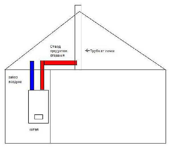Une chaudière à gaz suralimentée peut également être raccordée à une cheminée verticale conventionnelle en organisant l'apport d'air extérieur par une canalisation séparée. La solution technique doit être mise en œuvre lorsqu'un conduit de gaz a déjà été réalisé dans une maison privée, amené sur le toit. Dans d'autres cas, un tuyau coaxial est monté (illustré sur la photo) - c'est l'option la plus économique et la plus correcte.