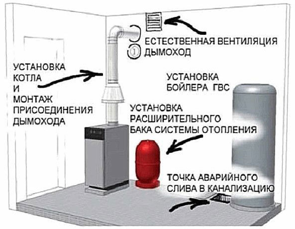 Les exigences et les normes relatives à l'aménagement des chaufferies dans les maisons privées sont réglementées dans le SNiP 42-02-2002.