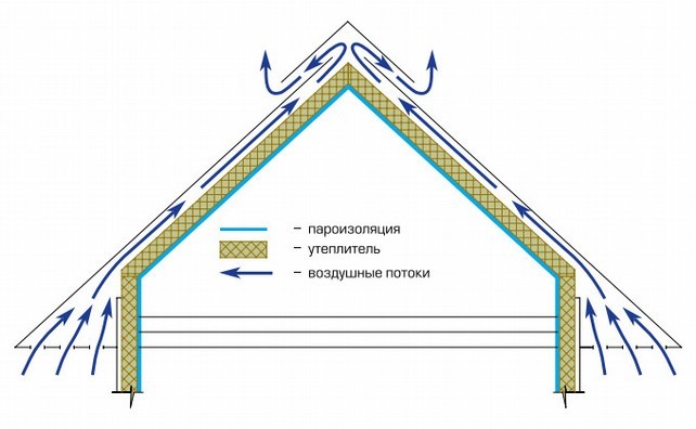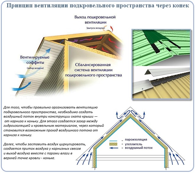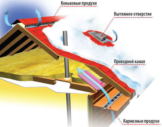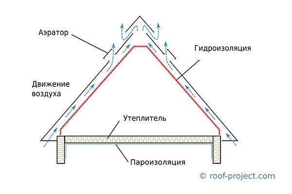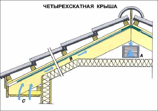 Lors de la construction de la ventilation du toit de la structure de la hanche, ils sont guidés par les principes déjà décrits ci-dessus. Il s'agit d'une méthode de ventilation naturelle, dans laquelle l'air pénètre dans l'espace sous le toit par le dessous de l'avant-toit et sort près du faîte.