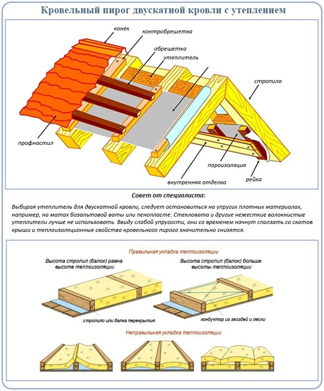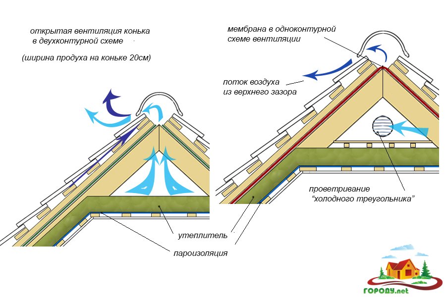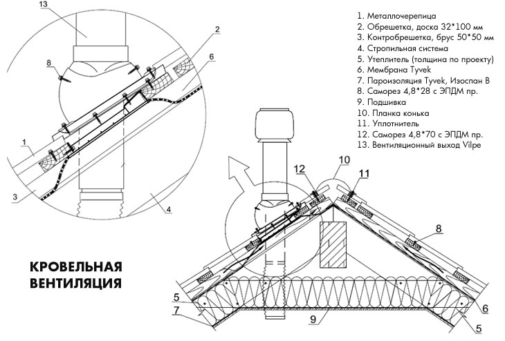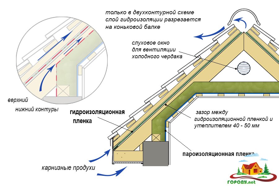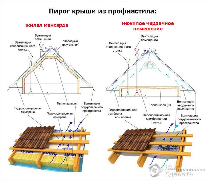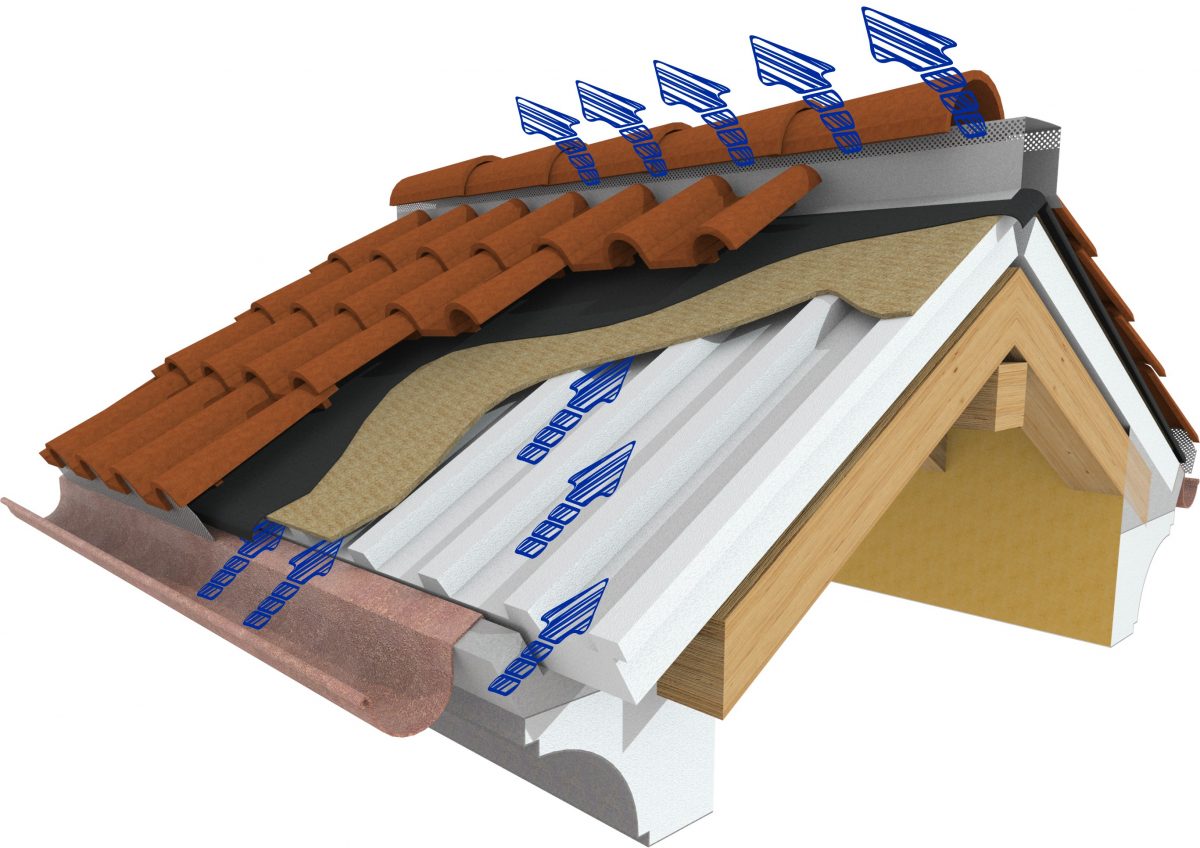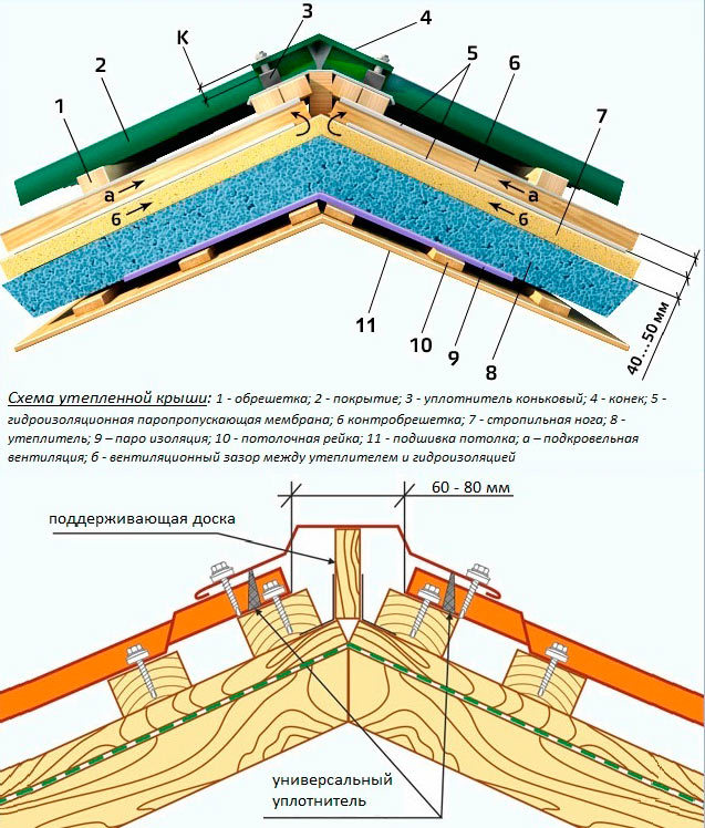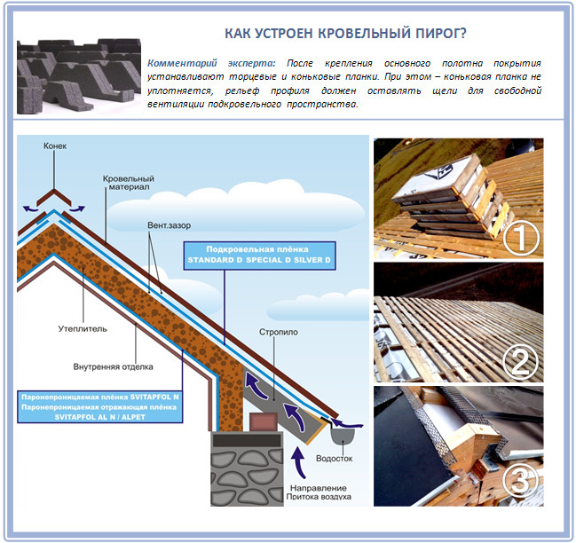 Les toits sont recouverts de carton ondulé dont la longueur des pentes ne dépasse pas 12 m.La disposition de la ventilation sous le toit dépend des couches du gâteau. Pour les greniers froids, il suffit de ne poser qu'une couche d'étanchéité sous le carton ondulé. Même un matériau de toiture ordinaire convient à cela. Les greniers chauds permettent la pose dans une tarte d'isolation thermique.Dans ce cas, l'imperméabilisation le protégera par le dessus et le pare-vapeur par le dessous. La fente de ventilation est assurée par un contre-treillis constitué de poutres en bois.