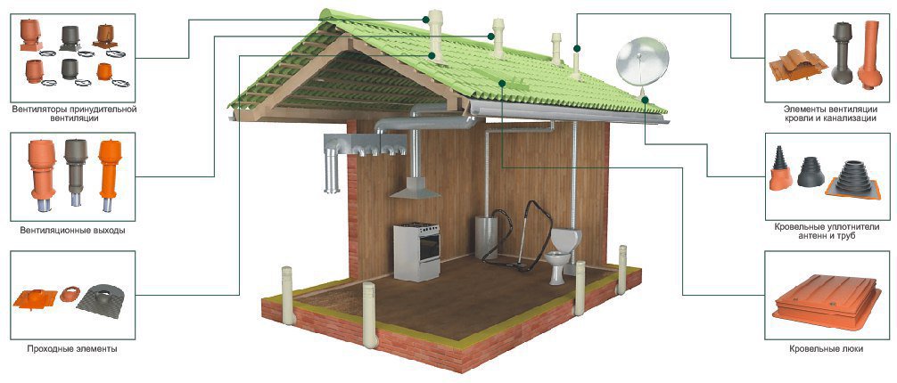 L'installation d'aérateurs de toit est l'option la plus courante. L'aérateur fait partie d'un petit morceau de tuyau avec une base plate pour une installation en surface et un parapluie qui couvre l'ouverture supérieure du tuyau contre les précipitations. Un filtre de protection est placé à l'intérieur.
