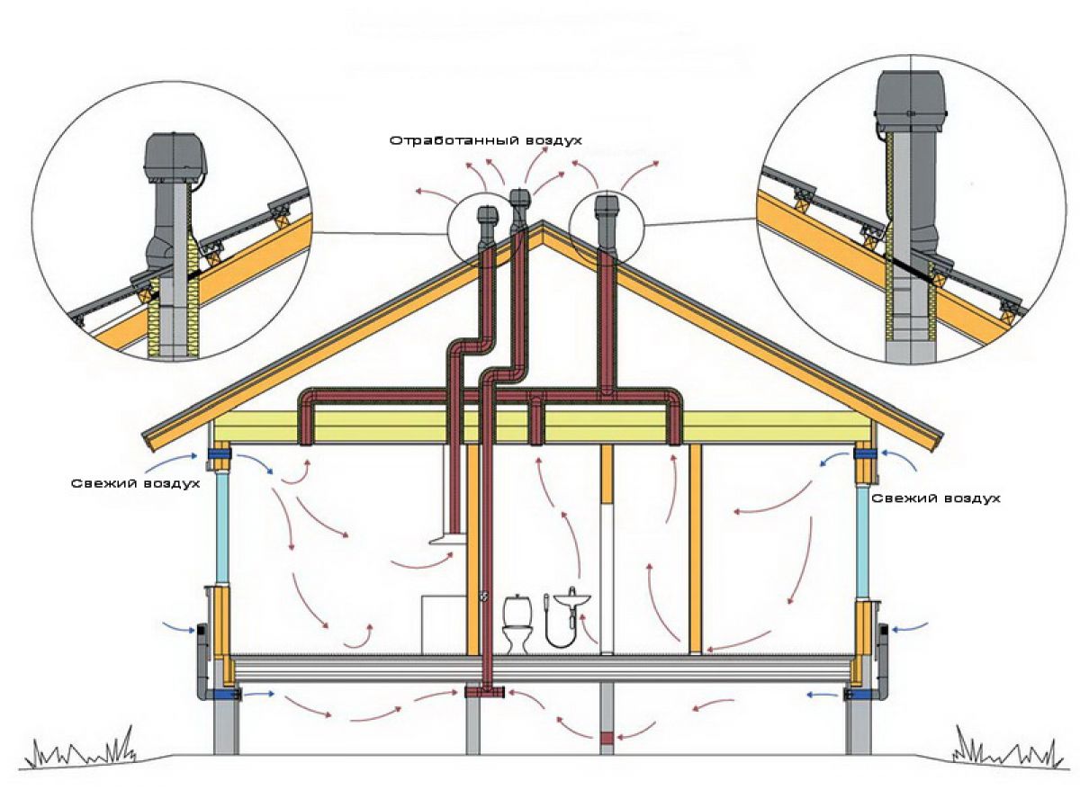 Aucun système de ventilation ne fonctionnera s'il n'y a pas de courant d'air. Au moyen de la poussée, le mouvement des masses d'air est effectué. La poussée peut être créée mécaniquement, au moyen de ventilateurs, ou naturelle. Pour que tout fonctionne naturellement, le tuyau de ventilation passe par le toit. Vous trouverez ci-dessous un schéma du fonctionnement du système de ventilation de la maison.