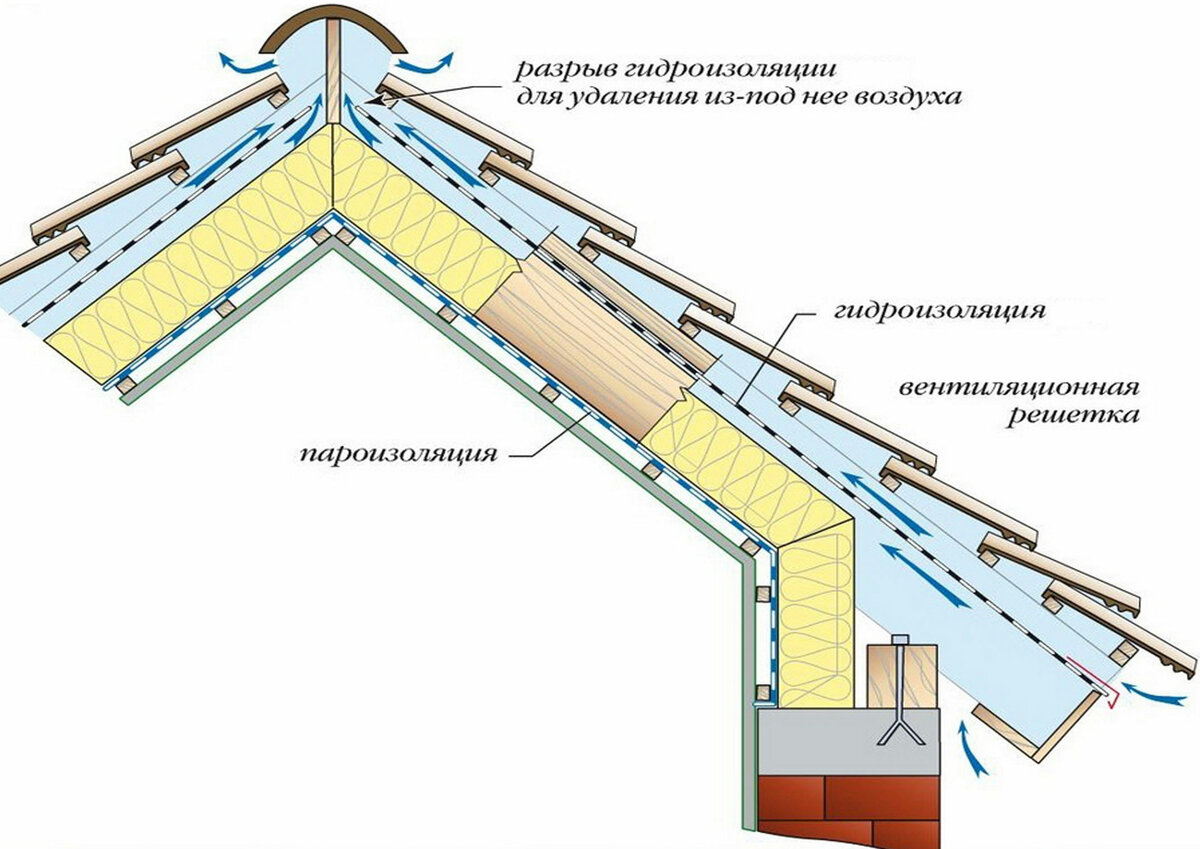 - Pour que plus tard le tirage d'air ne diminue pas, les canaux situés sous les éléments de toit doivent être isolés thermiquement. Ce point est pris en compte lors de la conception. L'isolation thermique protégera les canaux de l'accumulation d'humidité.