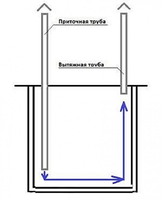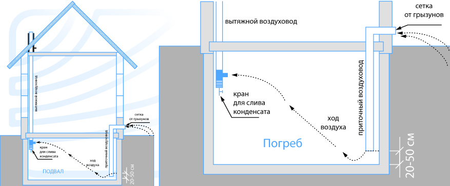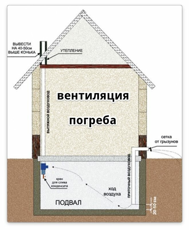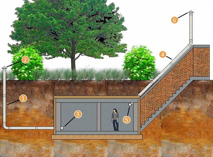 Si le sous-sol est sous le niveau du sol, la hotte est équipée de tuyaux en plastique ou en amiante-ciment d'un diamètre de 10 à 15 cm, qui sont sortis au-dessus de la surface à une hauteur de 30 cm et recouverts de barres de débris et de rongeurs . Cette méthode est naturelle et dépend des fluctuations de la température de la rue, de la force du vent et de l'humidité.