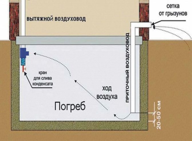 Pour les petites caves, un ou plusieurs trous dans les murs, sortis avec des tuyaux, suffiront. Cependant, si le stockage est suffisamment grand, il est préférable d'équiper le système d'alimentation et d'évacuation qui permettra de gérer efficacement le maintien du microclimat.