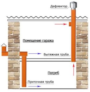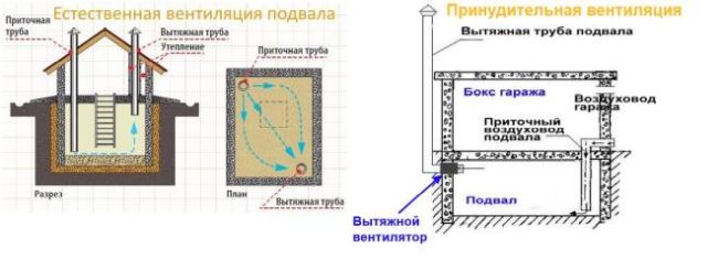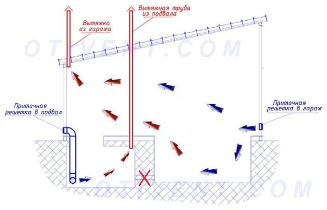 Lorsqu'il y a une cave sous le garage, mais qu'il n'y a pas de ventilation, divers poisons et toxines libérés par la voiture affecteront négativement les produits. La ventilation par évacuation aidera à résoudre ce problème. Ce type d'échange d'air est possible même naturellement ou grâce à des ventilateurs. Quant au haut du tuyau, il est affiché au-dessus du garage.