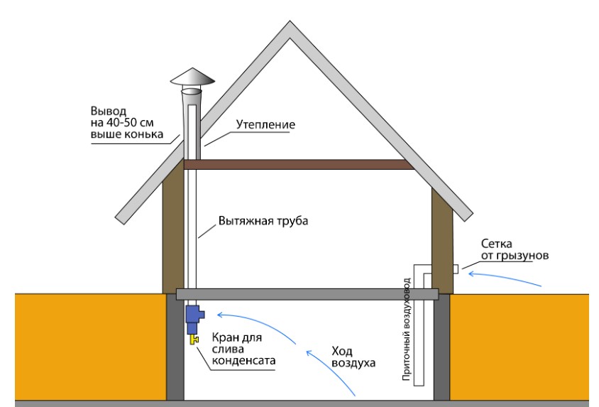 • L'air d'alimentation est formé dans la partie supérieure du sous-sol ou de la cave. S'il s'agit d'un bâtiment séparé, le tuyau est sorti sous le niveau du conduit d'évacuation.