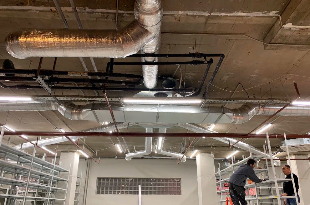 - Éviction. Le système de ventilation à soufflage mécanique est monté au niveau du sol. De l'air extérieur plus froid est fourni, déplaçant l'air chaud évacué vers le haut, là où les hottes sont installées.