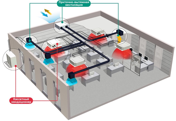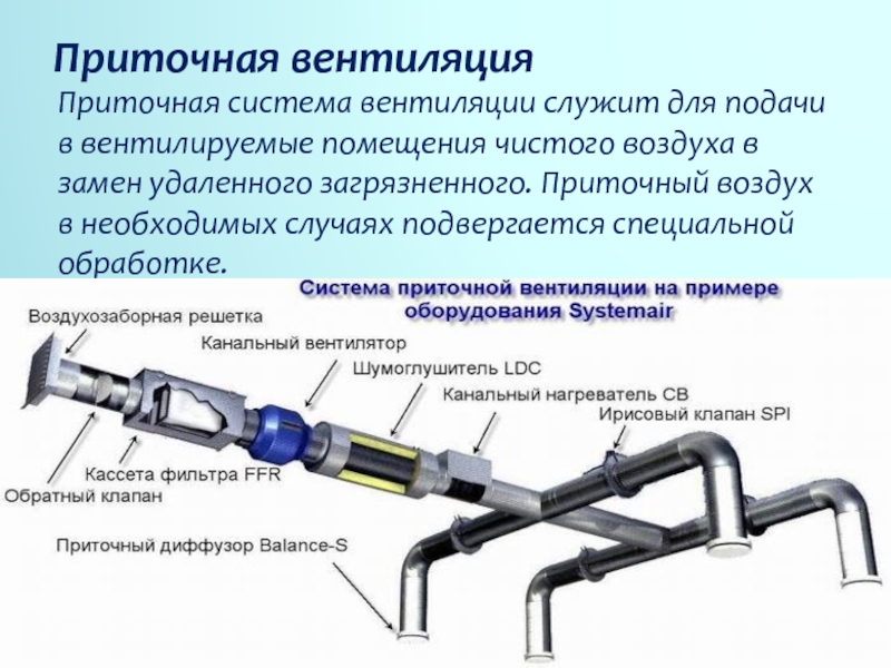 - Fournir. La tâche principale est de fournir de l'air frais à l'intérieur de l'atelier. Peut être avec envie artificielle et naturelle. Il est représenté par des ventilateurs de gaine aspirant l'air de l'extérieur. Souvent équipés de radiateurs.