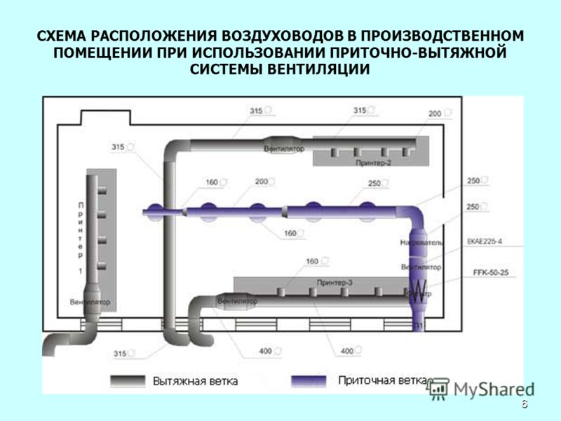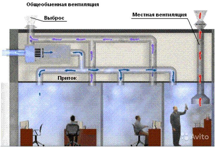 Sur l'organisation des échanges aériens - pour le général et le local La ventilation générale des locaux industriels crée un échange d'air uniforme, tandis que tous les paramètres : température, humidité, vitesse de l'air deviennent les mêmes en tout point de la pièce. Ce système vous permet de vous débarrasser rapidement des petits contaminants.