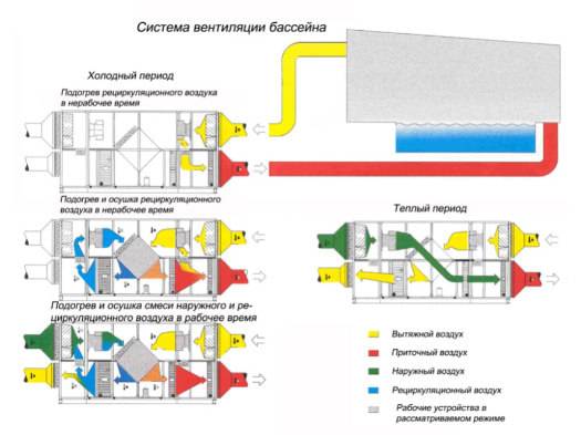En hiver, la température et l'humidité sont beaucoup plus basses. Un radiateur peut être utilisé pour le chauffage et l'humidification. Cela se fait en mélangeant des flux avec des températures différentes. L'air est refroidi dans les chambres à l'aide de petites gouttelettes d'eau. Certaines pièces nécessitent l'organisation d'un système spécial de ventilation et de climatisation. Il s'agit par exemple des piscines, où le taux d'humidité est constamment élevé.