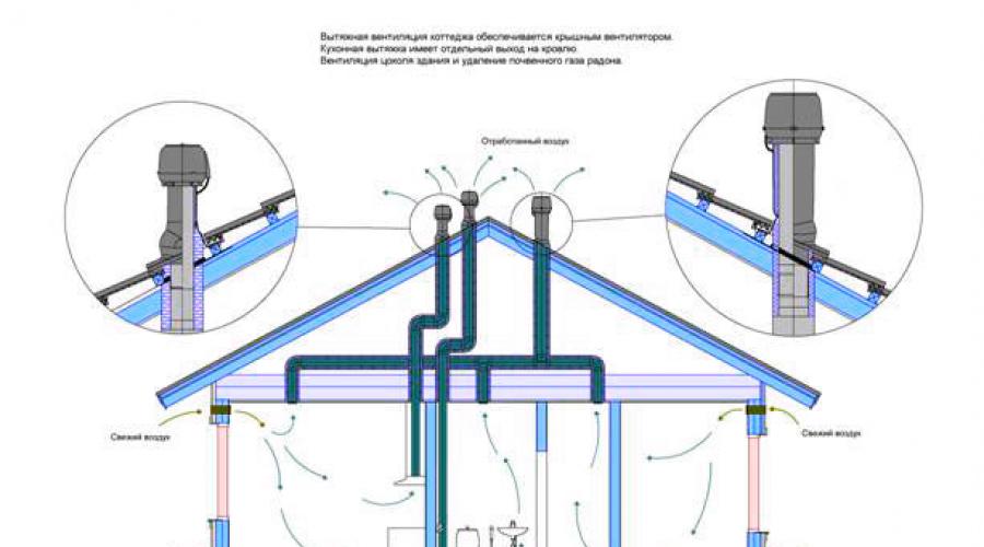 Conseils utiles : si vous placez des vannes sous les fenêtres, en hiver l'air se réchauffera avec la chaleur des radiateurs. Lorsque vous amenez le tuyau d'échappement sur le toit, vous devez monter un parapluie / champignon sur le dessus pour vous protéger contre les précipitations ou un déflecteur.