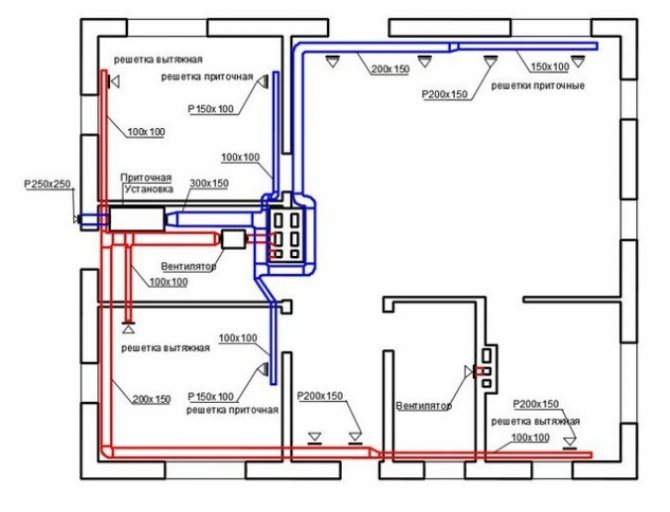 Type d'alimentation et d'extraction - les ventilateurs sont installés à la fois sur l'extraction et sur l'entrée. Il existe des blocs d'équipement prêts à l'emploi qui sont montés dans le grenier sous la forme de conduits à travers les pièces qui traversent le plafond. Les blocs sont obligatoirement complétés par des réchauffeurs, des récupérateurs, des filtres.