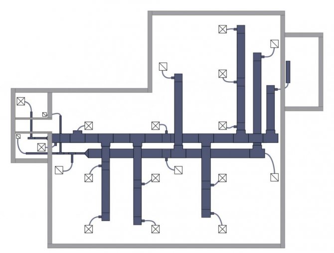 - Détermination du schéma d'installation des conduits. Le principal doit capturer tous les locaux de service avec un seul conduit d'air. Il est réalisé au-dessus des plafonds horizontalement.
