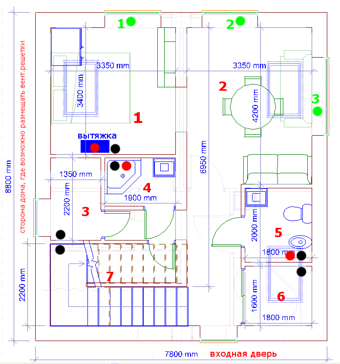 - Moins il y a de canaux, mieux c'est. Ce problème est résolu territorialement - les locaux de la cuisine, les sanitaires sont situés à proximité les uns des autres («voisins»). Soit dit en passant, cette exigence s'applique non seulement à la ventilation, mais également aux systèmes d'égouts et d'approvisionnement en eau.